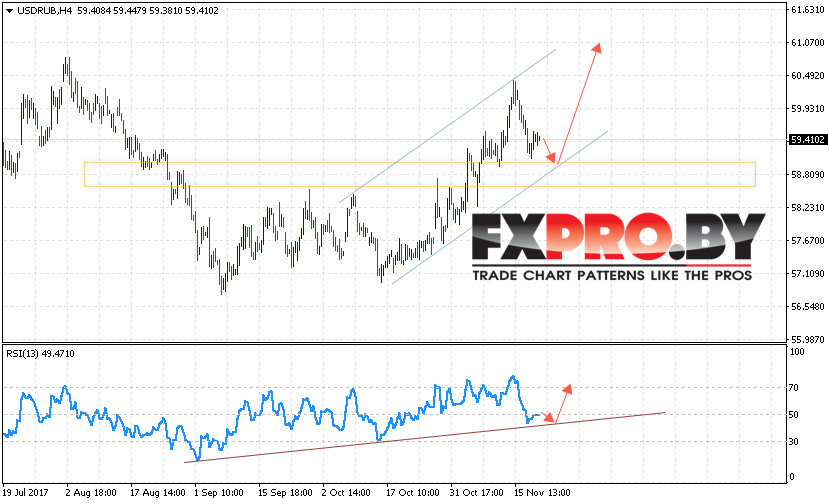 Таким образом, USD/RUB прогноз курса Доллара на 22 ноября 2017 предполагает попытку теста нижней границы восходящего канала вблизи уровня 58.80, откуда стоит ожидать отскок и продолжение роста курса Доллар против Рубля выше уровня 61.20, дополнительным сигналом в пользу роста USD/RUB выступит тест линии поддержки на индикаторе относительной силы.