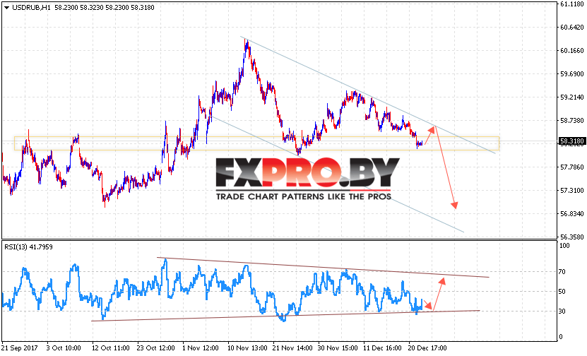 Таким образом, USD/RUB прогноз курса Доллара на 26 декабря 2017 предполагает попытку теста уровня 58.90, откуда стоит ожидать отскок и попытку падения курса Доллара против Рубля с целью ниже уровня 56.90, дополнительным сигналом в пользу падения пары выступит тест линии тренда на индикаторе относительной силы, отменой варианта падения станет пробой верхней границы канала.