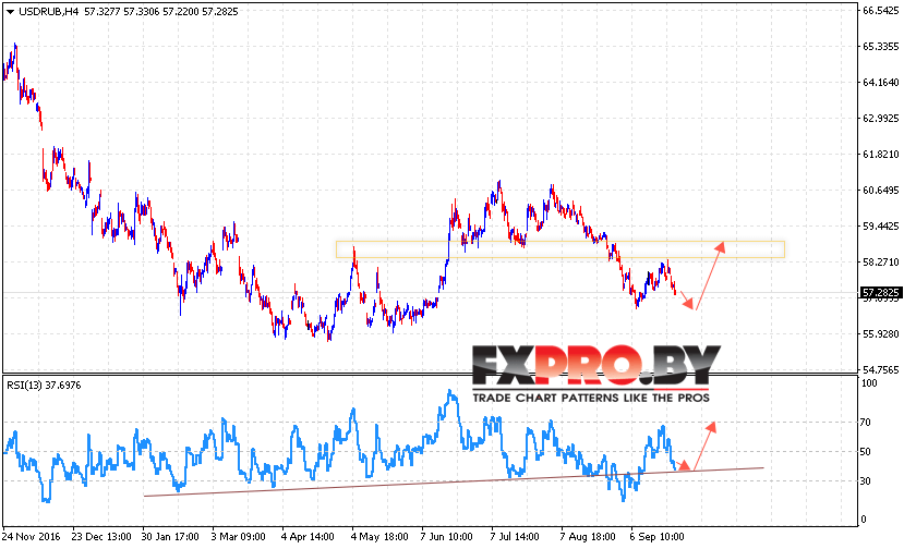 Таким образом, USD/RUB прогноз курса Доллара на 26 сентября 2017 предполагает попытку теста уровня 57 рублей за доллар и начала роста к уровня сопротивления, дополнительным сигналом в пользу роста курса Доллара выступает тест линии тренда на индикаторе относительной силы, отменой варианта роста USD/RUB станет пробой уровня 56.50.