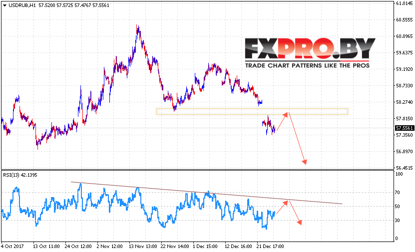 Таким образом, USD/RUB прогноз курса Доллара на 29 декабря 2017 предполагает попытку теста сопротивления вблизи уровня 57.90, откуда стоит ожидать отскок и попытку падения курса Доллара против Рубля с целью ниже уровня 56.60, дополнительным сигналом в пользу падения пары выступит тест линии тренда на индикаторе относительной силы, отменой варианта падения станет пробой уровня сопротивления.