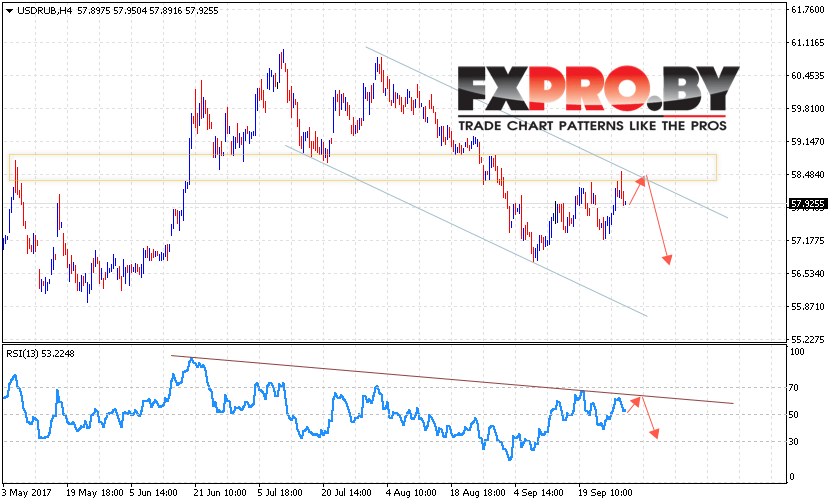 Таким образом, USD/RUB прогноз курса Доллара на 29 сентября 2017 предполагает попытку теста верхней границы канала вблизи 58.40 рублей за доллар и продолжения падения курса Доллара в область ниже 57.10, дополнительным сигналом в пользу снижения USD/RUB выступает тест сопротивления тренда на индикаторе относительной силы.