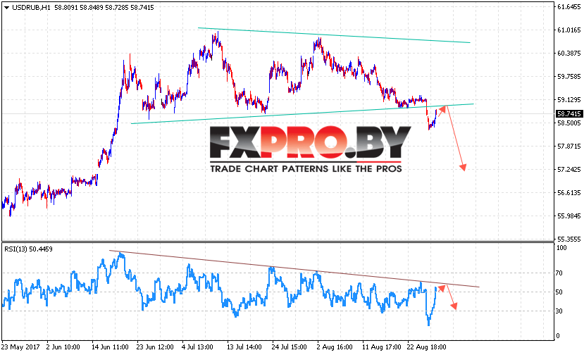 Таким образом, USD/RUB прогноз курса Доллара на 30 августа 2017 предполагает попытку отскока от пробитой границы модели Треугольник и продолжения снижения в область ниже уровня 57.25, дополнительным сигналом выступит тест сопротивления тренда на индикаторе относительной силы, отменой станет пробой уровня 59.50.