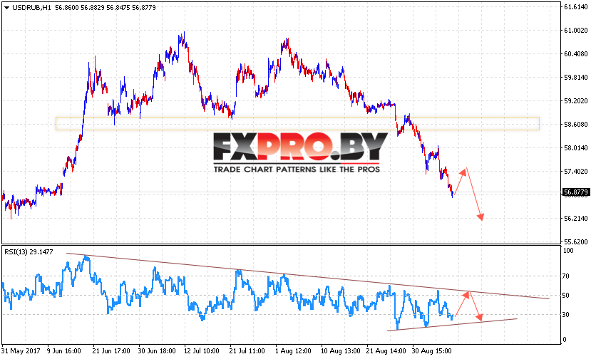 Таким образом, USD/RUB прогноз курса Доллара на 8 сентября 2017 предполагает попытку отскока и теста уровня 57.40, откуда стоит ожидать продолжения падения в область ниже уровня 56.20, дополнительным сигналом выступит тест нисходящей линии тренда на индикаторе относительной силы.