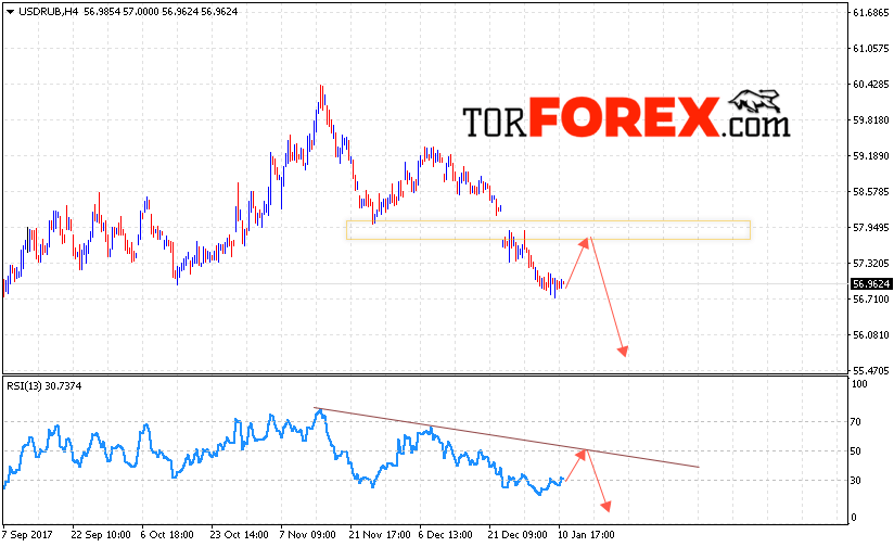 Таким образом, USD/RUB прогноз курса Доллара на 12 января 2018 предполагает попытку коррекции в область сопротивления уровня 57.75, откуда стоит ожидать отскок и попытку продолжения падения курса Доллара против Рубля с целью ниже уровня 55.70, дополнительным сигналом в пользу падения выступит тест линии тренда на индикаторе относительной силы.