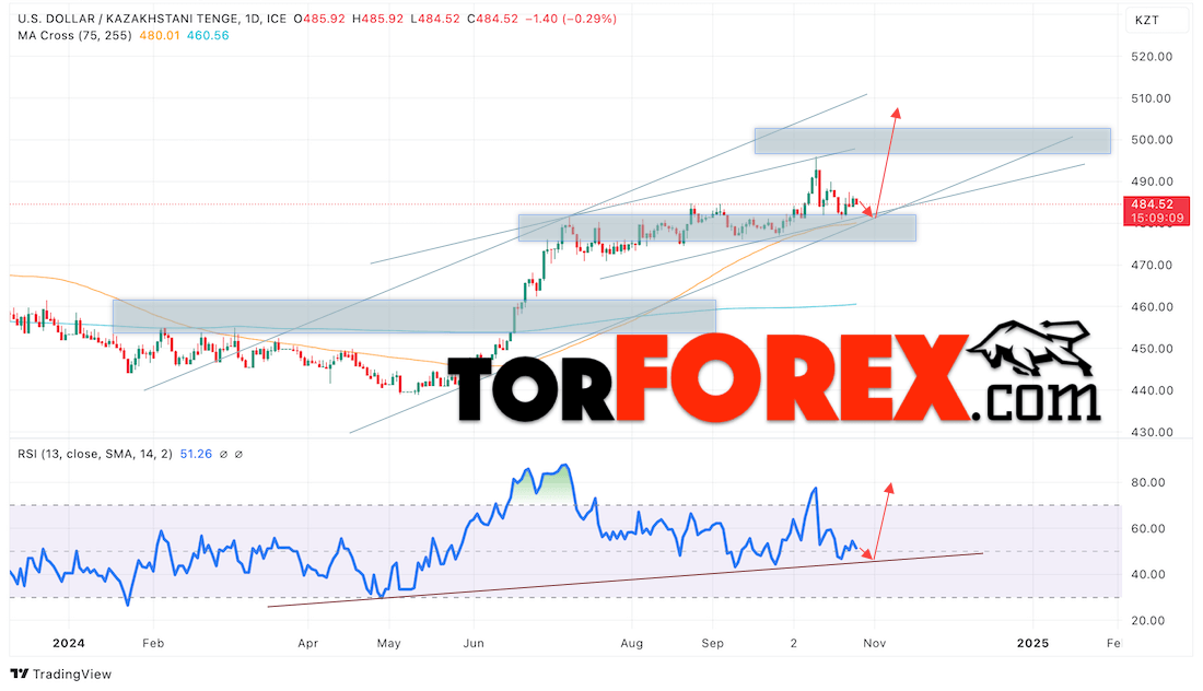 Дополнительным сигналом в пользу подъёма валютной пары USD/KZT 28 октября — 1 ноября 2024 выступит отбой от восходящей линии тренда на индикаторе относительной силы (RSI). Вторым сигналом станет отток от нижней границы восходящего канала. Отменой варианта роста пары USD/KZT выступит падение котировок и пробой уровня 476.55 Тенге за Доллар. Это укажет на пробой области поддержки и продолжение падения пары Доллар Казахский Тенге в область ниже уровня 471.55. Подтверждением росту пары выступит пробой области сопротивления и закрытие котировок актива над уровнем 490.65.