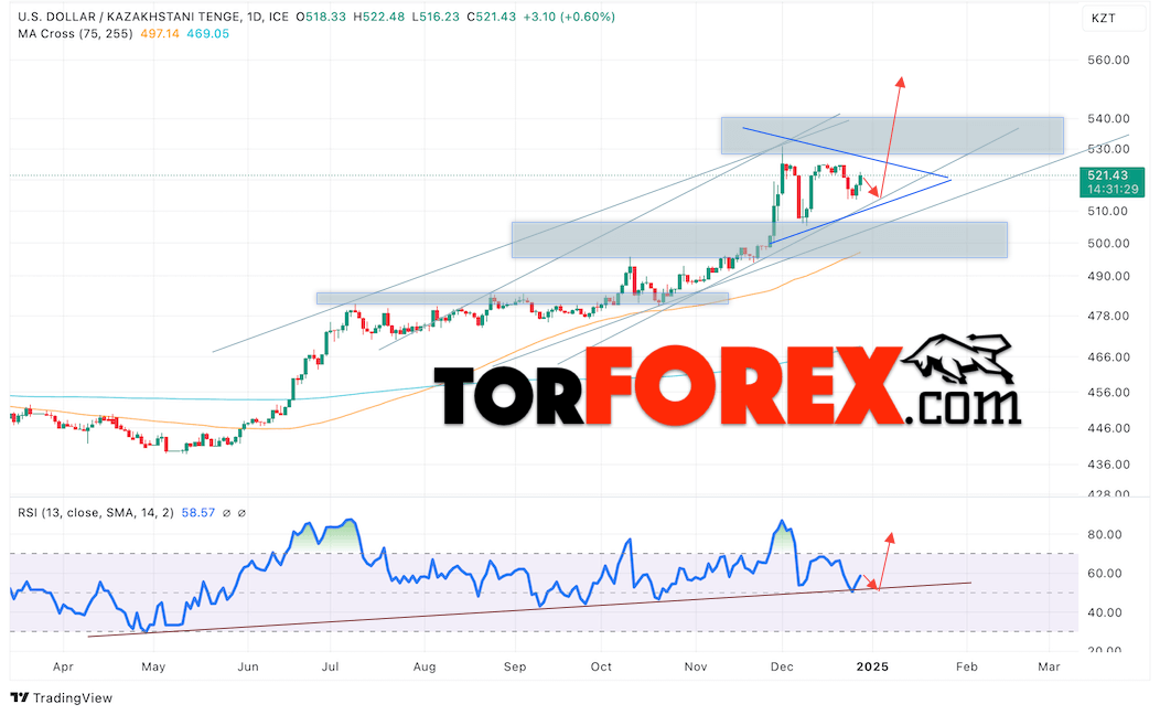 Дополнительным сигналом в пользу подъёма валютной пары USD/KZT 30 декабря 2024 — 3 января 2025 выступит отбой от восходящей линии тренда на индикаторе относительной силы (RSI). Вторым сигналом станет отток от нижней границы модели «Треугольник». Отменой варианта роста пары USD/KZT на текущий торговой неделе выступит падение котировок и пробой уровня 505.05 Тенге за Доллар. Это укажет на пробой области поддержки и продолжение падения пары Доллар Казахский Тенге в область ниже уровня 490.05. Подтверждением росту пары выступит пробой области сопротивления и закрытие котировок актива над уровнем 532.85.