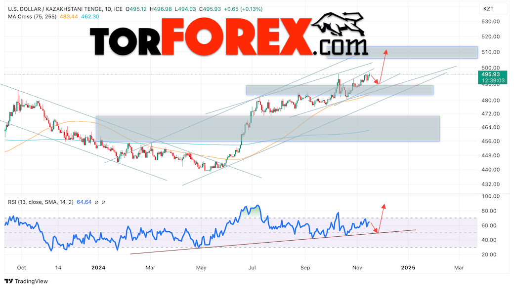 Дополнительным сигналом в пользу подъёма валютной пары USD/KZT 18 — 22 ноября 2024 выступит отбой от восходящей линии тренда на индикаторе относительной силы (RSI). Вторым сигналом станет отток от нижней границы восходящего канала. Отменой варианта роста пары USD/KZT на текущий торговой неделе выступит падение котировок и пробой уровня 481.65 Тенге за Доллар. Это укажет на пробой области поддержки и продолжение падения пары Доллар Казахский Тенге в область ниже уровня 475.45. Подтверждением росту пары выступит пробой области сопротивления и закрытие котировок актива над уровнем 500.05.