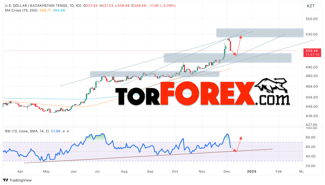 Дополнительным сигналом в пользу подъёма валютной пары USD/KZT 9 — 13 декабря 2024 выступит отбой от восходящей линии тренда на индикаторе относительной силы (RSI). Вторым сигналом станет отток от нижней границы восходящего канала. Отменой варианта роста пары USD/KZT на текущий торговой неделе выступит падение котировок и пробой уровня 496.05 Тенге за Доллар. Это укажет на пробой области поддержки и продолжение падения пары Доллар Казахский Тенге в область ниже уровня 485.05. Подтверждением росту пары выступит пробой области сопротивления и закрытие котировок актива над уровнем 520.05.