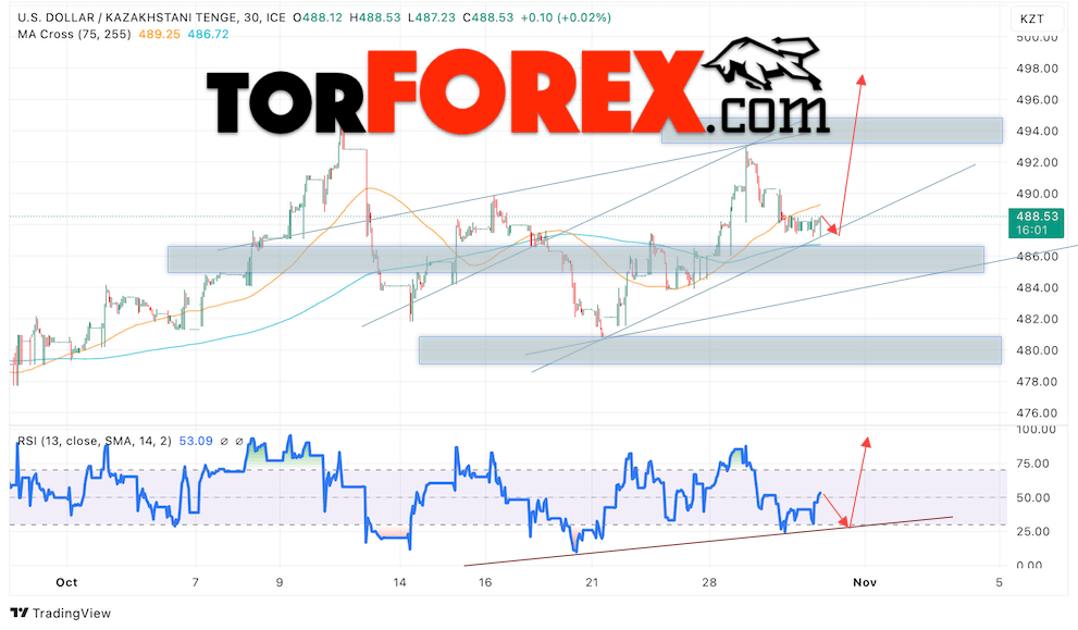 Дополнительным сигналом в пользу подъёма валютной пары USD/KZT 1 ноября 2024 выступит отбой от линии поддержки на индикаторе относительной силы (RSI). Вторым сигналом станет отток от нижней границы бычьего канала. Отменой варианта подъёма пары USD/KZT выступит падение котировок и пробой уровня 486.25 Тенге за Доллар. Это укажет на пробой области поддержки и продолжение падения пары Доллар Казахский Тенге в область ниже уровня 484.45. Подтверждением росту пары выступит пробой области сопротивления и закрытие котировок актива над уровнем 490.45.