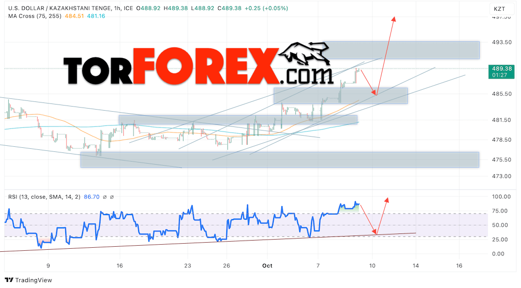 Валютная пара Доллар США Казахский Тенге USDKZT продолжает движение в рамках роста и бычьего канала. В момент публикации прогноза курс Доллара США к Казахскому Тенге составляет 489.38. Скользящие средние указывают на наличие краткосрочной бычьей тенденции. Цены пробили область между сигнальными линиями вверх, что указывает на давление со стороны покупателей американской валюты и потенциальное продолжение роста Доллара США против Казахского Тенге. В рамках прогноза курса Доллара на 10 октября 2024 стоит ожидать попытку развития медвежьей коррекции цены и тест уровня поддержки вблизи области 484.05 Казахский Тенге за Доллар США. Затем, отскок вверх и продолжение подъёма валютной пары в область выше уровня 494.55.