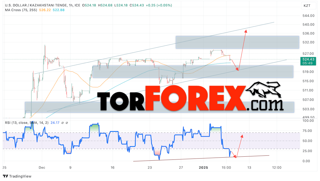 Таким образом, Курс Тенге прогноз на сегодня 10 января 2025 предполагает попытку развития медвежьей коррекции и тест уровня поддержки вблизи области 520.05. Откуда стоит ожидать отбой котировок вверх и продолжения роста курса Доллара США против Казахского Тенге с целью выше отметки 536.65. Дополнительным сигналом в пользу подъёма пары станет тест линии тренда на индикаторе относительной силы. Отменой варианта роста выступит пробой области поддержки и закрытие котировок ниже уровня 517.05. В таком случае стоит ожидать продолжения падения курса доллара США против Тенге к уровню 505.05.
