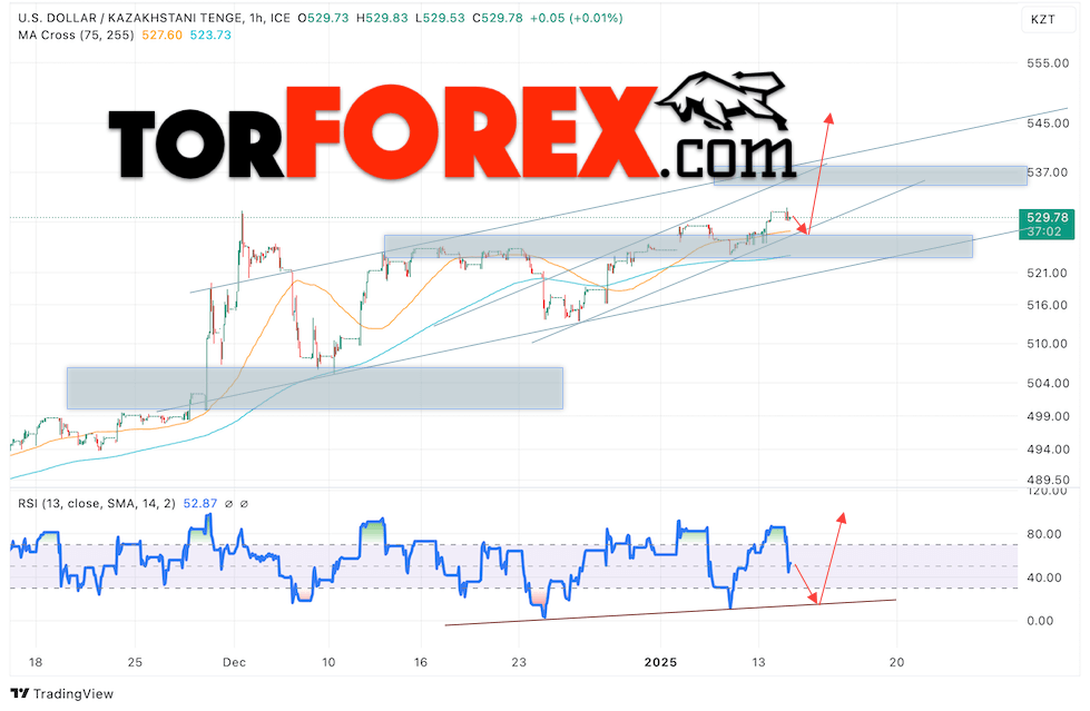 Таким образом, Курс Тенге прогноз на сегодня 15 января 2025 предполагает попытку развития медвежьей коррекции и тест уровня поддержки вблизи области 527.25. Откуда стоит ожидать отбой котировок вверх и продолжения роста курса Доллара США против Казахского Тенге с целью выше отметки 545.65. Дополнительным сигналом в пользу подъёма пары станет тест линии тренда на индикаторе относительной силы. Отменой варианта роста выступит пробой области поддержки и закрытие котировок ниже уровня 522.55. В таком случае стоит ожидать продолжения падения курса доллара США против Тенге к уровню 510.05.