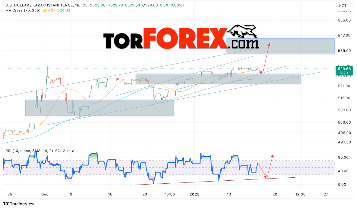 Дополнительным сигналом в пользу роста валютной пары USD/KZT 17 января 2025 выступит отбой от линии бычьего тренда на индикаторе относительной силы (RSI). Вторым сигналом станет отскок от нижней границы бычьего канала. Отменой варианта роста валютной пары USD/KZT выступит падение котировок и пробой уровня 521.05 Тенге за Доллар. Это укажет на пробой области поддержки и продолжение падения пары Доллар Казахский Тенге в область ниже уровня 510.05. Подтверждением росту пары выступит пробой области сопротивления и закрытие котировок актива над уровнем 533.65.