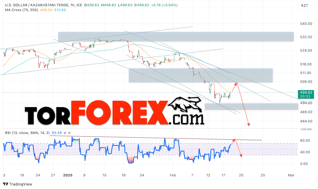 Дополнительным сигналом в пользу падения валютной пары USD/KZT 19 февраля 2025 выступит отбой от линии тренда на индикаторе относительной силы (RSI). Вторым сигналом станет отскок от верхней границы медвежьего канала. Отменой варианта падения валютной пары USD/KZT выступит сильный рост котировок и пробой уровня 515.05 Тенге за Доллар. Это укажет на пробой области сопротивления и продолжение роста пары Доллар Казахский Тенге в область выше уровня 525.05. Подтверждением падению пары выступит пробой области поддержки и закрытие котировок актива под уровнем 490.75.