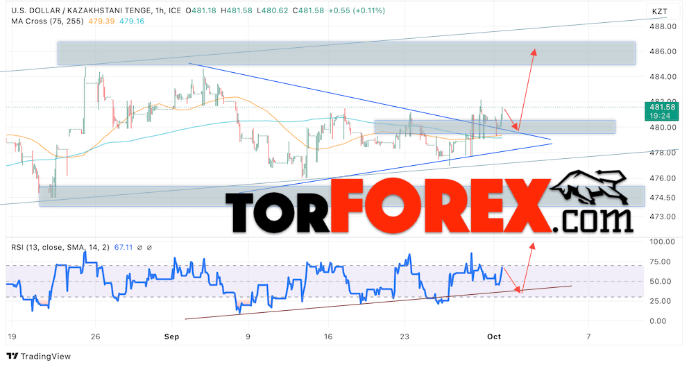 Дополнительным сигналом в пользу роста валютной пары USD/KZT 2 октября 2024 выступит отбой от бычьей линии тренда на индикаторе относительной силы (RSI). Вторым сигналом станет отток от верхней границы модели «Треугольник». Отменой варианта подъёма пары USD/KZT выступит падение котировок и пробой уровня 476.05 Тенге за Доллар. Это укажет на пробой области поддержки и продолжение падения пары Доллар Казахский Тенге в область ниже уровня 472.55. Подтверждением росту пары выступит пробой области сопротивления и закрытие котировок актива над уровнем 483.55.