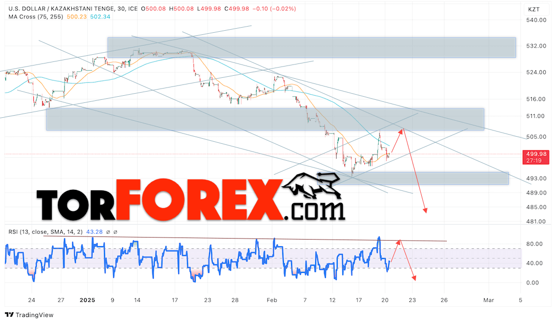 Дополнительным сигналом в пользу падения валютной пары USD/KZT 21 февраля 2025 выступит отбой от линии тренда на индикаторе относительной силы (RSI). Вторым сигналом станет отскок от верхней границы медвежьего канала. Отменой варианта падения валютной пары USD/KZT выступит сильный рост котировок и пробой уровня 517.05 Тенге за Доллар. Это укажет на пробой области сопротивления и продолжение роста пары Доллар Казахский Тенге в область выше уровня 525.05. Подтверждением падению пары выступит пробой области поддержки и закрытие котировок актива под уровнем 497.05, что укажет на пробой нижней границы бычьего канала коррекции.
