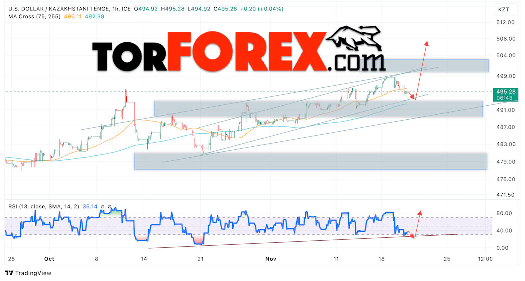 Дополнительным сигналом в пользу подъёма валютной пары USD/KZT 21 ноября 2024 выступит отбой от линии поддержки на индикаторе относительной силы (RSI). Вторым сигналом станет отток от нижней границы бычьего канала. Отменой варианта подъёма пары USD/KZT выступит падение котировок и пробой уровня 492.25 Тенге за Доллар. Это укажет на пробой области поддержки и продолжение падения пары Доллар Казахский Тенге в область ниже уровня 487.65. Подтверждением росту пары выступит пробой области сопротивления и закрытие котировок актива над уровнем 498.45.