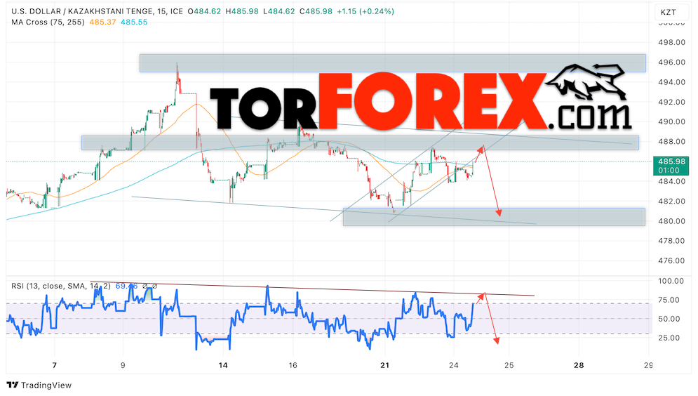 Дополнительным сигналом в пользу снижения валютной пары USD/KZT 25 октября 2024 выступит отбой от линии сопротивления на индикаторе относительной силы (RSI). Вторым сигналом станет отток от верхней границы нисходящего канала. Отменой варианта снижения пары USD/KZT выступит сильный рост котировок и пробой уровня 491.05 Тенге за Доллар. Это укажет на пробой области сопротивления и продолжение роста пары Доллар Казахский Тенге в область выше уровня 496.05. Подтверждением падению пары выступит пробой области поддержки и закрытие котировок актива под уровнем 484.05.
