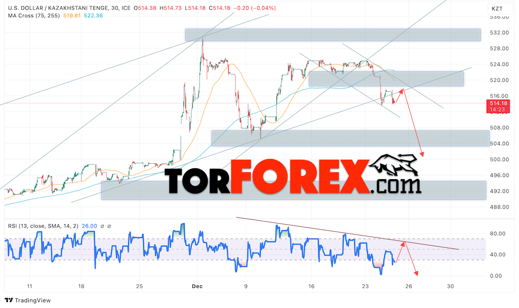 Дополнительным сигналом в пользу падения валютной пары USD/KZT 26 декабря 2024 выступит отбой от линии тренда на индикаторе относительной силы (RSI). Вторым сигналом станет отток от нижней границы бычьего канала. Отменой варианта снижения валютной пары USD/KZT выступит сильный рост котировок и пробой уровня 525.05 Тенге за Доллар. Это укажет на пробой области сопротивления и продолжение роста пары Доллар Казахский Тенге в область выше уровня 545.65. Подтверждением падению пары выступит пробой области поддержки и закрытие котировок актива под уровнем 512.05.