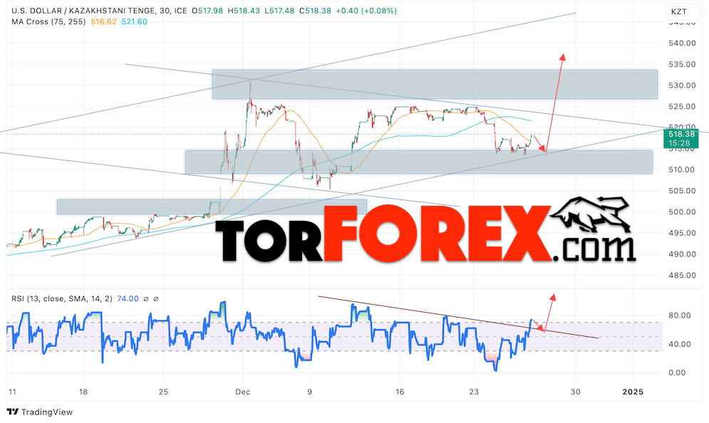 Дополнительным сигналом в пользу роста валютной пары USD/KZT 27 декабря 2024 выступит отбой от пробитой линии тренда на индикаторе относительной силы (RSI). Вторым сигналом станет отток от нижней границы бычьего канала. Отменой варианта роста валютной пары USD/KZT выступит падение котировок и пробой уровня 512.05 Тенге за Доллар. Это укажет на пробой области поддержки и продолжение падения пары Доллар Казахский Тенге в область ниже уровня 500.05. Подтверждением росту пары выступит пробой области сопротивления и закрытие котировок актива над уровнем 525.65, что укажет на пробой верхней границы нисходящего канала коррекции.