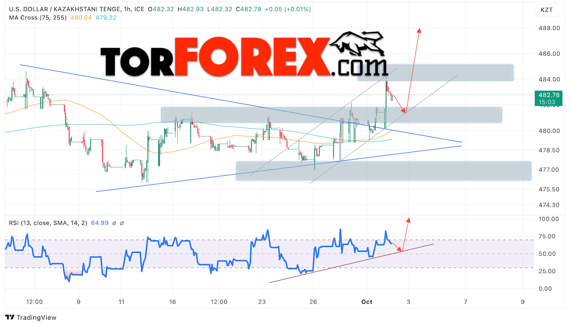 Дополнительным сигналом в пользу роста валютной пары USD/KZT 3 октября 2024 выступит отбой от бычьей линии тренда на индикаторе относительной силы (RSI). Вторым сигналом станет отток от нижней границы бычьего канала. Отменой варианта подъёма пары USD/KZT выступит падение котировок и пробой уровня 477.05 Тенге за Доллар. Это укажет на пробой области поддержки и продолжение падения пары Доллар Казахский Тенге в область ниже уровня 472.05. Подтверждением росту пары выступит пробой области сопротивления и закрытие котировок актива над уровнем 484.45.