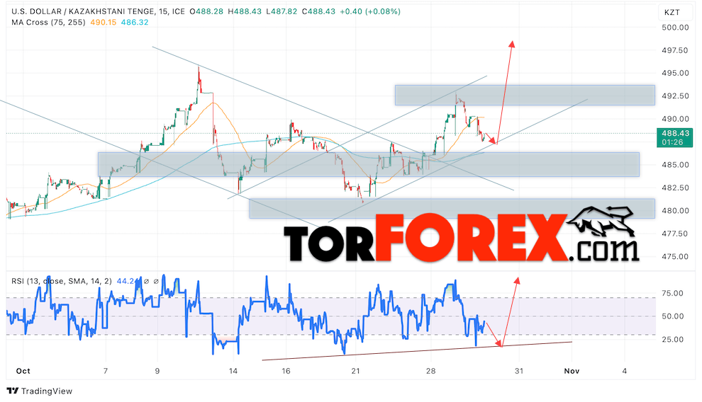 Валютная пара Доллар США Казахский Тенге USDKZT продолжает движение в рамках медвежьей коррекции и бычьего канала. В момент публикации прогноза курс Доллара США к Казахскому Тенге составляет 488.43. Скользящие средние указывают на наличие краткосрочной восходящей тенденции. Цены вновь тестируют область между сигнальными линиями, что указывает на давление со стороны покупателей американской валюты и потенциальное продолжение роста Доллара США против Казахского Тенге. В рамках прогноза курса Доллара на 31 октября 2024 стоит ожидать попытку продолжения развития медвежьей коррекции цены и тест уровня поддержки вблизи области 487.85 Казахский Тенге за Доллар США. Затем, отскок вверх и продолжение роста валютной пары в область выше уровня 497.55.