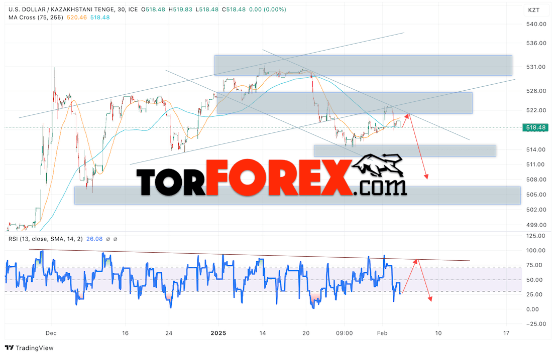 Дополнительным сигналом в пользу падения валютной пары USD/KZT 6 февраля 2025 выступит отбой от линии тренда на индикаторе относительной силы (RSI). Вторым сигналом станет отскок от верхней границы медвежьего канала. Отменой варианта падения валютной пары USD/KZT выступит сильный рост котировок и пробой уровня 524.65 Тенге за Доллар. Это укажет на пробой области сопротивления и продолжение роста пары Доллар Казахский Тенге в область выше уровня 535.65. Подтверждением падению пары выступит пробой области поддержки и закрытие котировок актива под уровнем 515.65.