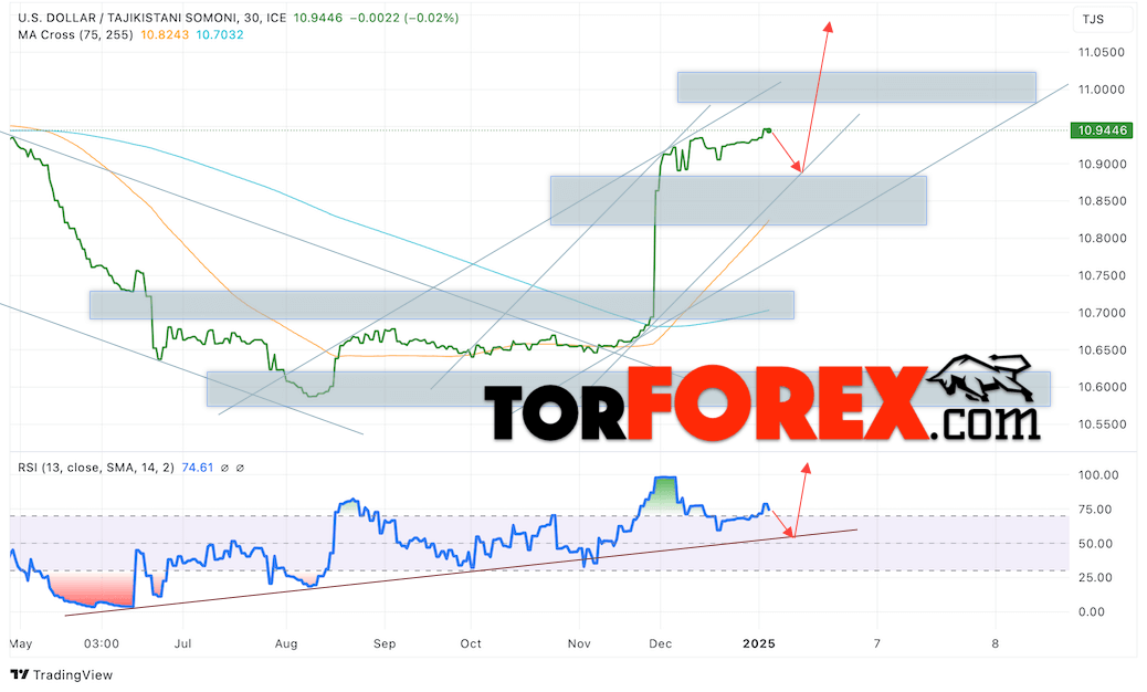 Таким образом, Курс Тенге прогноз на сегодня 7 января 2025 предполагает попытку развития медвежьей коррекции и тест уровня поддержки вблизи области 523.65. Откуда стоит ожидать отбой котировок вверх и продолжения роста курса Доллара США против Казахского Тенге с целью выше отметки 542.55. Дополнительным сигналом в пользу подъёма пары станет тест линии тренда на индикаторе относительной силы. Отменой варианта роста выступит пробой области поддержки и закрытие котировок ниже уровня 520.05. В таком случае стоит ожидать продолжения падения курса доллара США против Тенге к уровню 505.05.