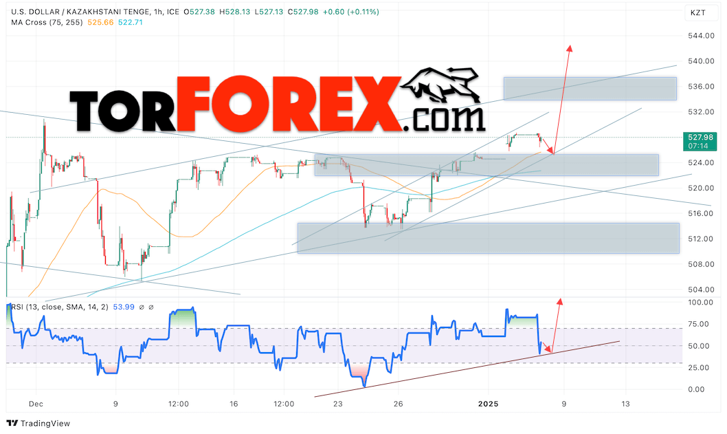 Дополнительным сигналом в пользу роста валютной пары USD/KZT 9 января 2025 выступит отбой от линии бычьего тренда на индикаторе относительной силы (RSI). Вторым сигналом станет отскок от нижней границы бычьего канала. Отменой варианта роста валютной пары USD/KZT выступит падение котировок и пробой уровня 522.05 Тенге за Доллар. Это укажет на пробой области поддержки и продолжение падения пары Доллар Казахский Тенге в область ниже уровня 505.05. Подтверждением росту пары выступит пробой области сопротивления и закрытие котировок актива над уровнем 533.65.