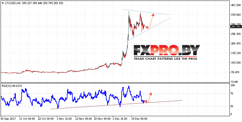 Таким образом, Курс Litecoin (LTC/USD) прогноз на 22 декабря 2017 предполагает попытку теста нижней модели «Треугольник» вблизи вблизи 280, откуда стоит ожидать отскок и продолжения роста в область выше уровня 355, дополнительным сигналом в пользу роста Litecoin выступит тест линии поддержки на индикаторе относительной силы.