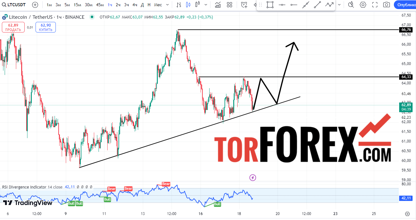 Цена LTC демонстрирует восходящий потенциал, но возможна краткосрочная коррекция до зоны FVG. Ожидайте реакцию цены на ключевых уровнях для поиска точек входа.