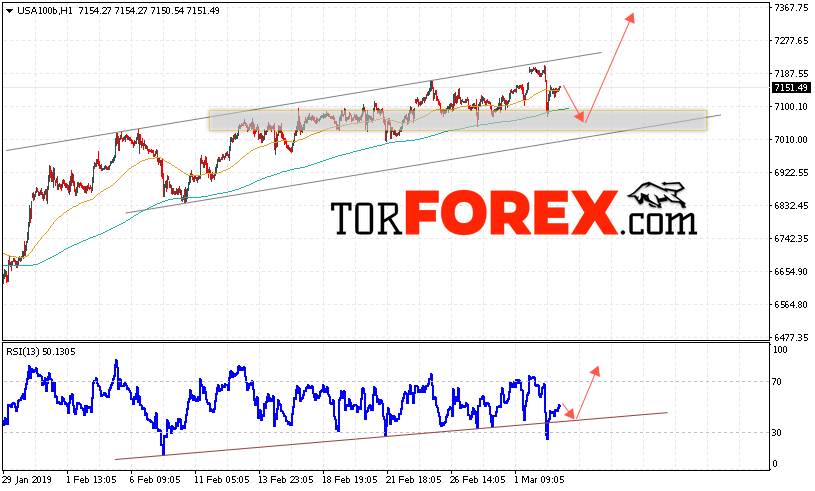 Таким образом, NASDAQ прогноз и аналитика на 6 марта 2019 предполагает попытку теста нижней границы канала вблизи области 7075. Затем продолжение роста в область выше уровня 7365. В пользу подъёма котировок NASDAQ выступит тест линии поддержки на индикаторе относительной силы. Отменой варианта роста выступит падение и пробой области 6945. Это укажет на продолжение падения с целью ниже области 6670.