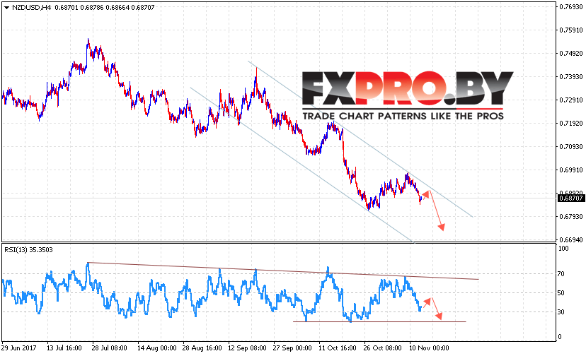 Таким образом, Форекс прогноз и аналитика NZD/USD на 15 ноября 2017 предполагает попытку отскока от верхней границы канала и продолжение падения пары с целью ниже уровня 0.6740, отменой варианта падения NZD/USD станет сильный рост и пробой уровня 0.6950.