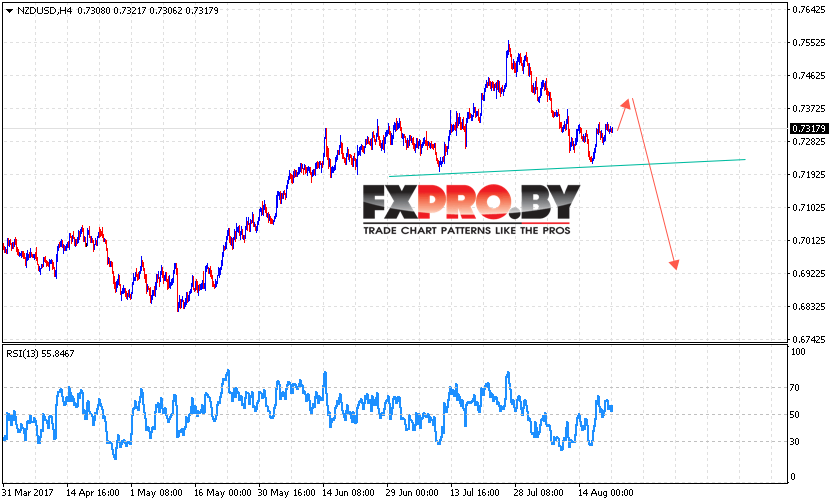 Таким образом, Форекс прогноз и аналитика NZD/USD на 22 августа 2017 предполагает попытку завершения формирования разворотной модели Голова и плечи вблизи области 0.74 и начала снижения с целью ниже уровня 0.6950.