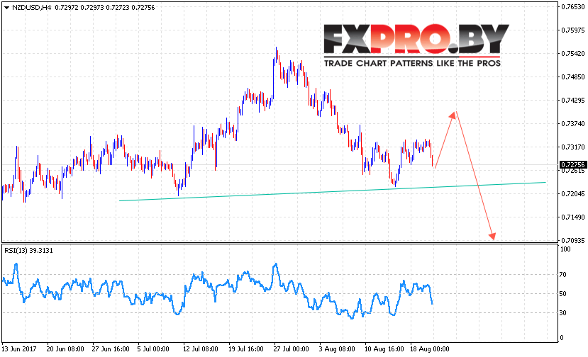 Таким образом, Форекс прогноз и аналитика NZD/USD на 23 августа 2017 предполагает попытку завершения формирования разворотной модели Голова и плечи вблизи области 0.74 и начала падения с потенциальной целью ниже уровня 0.6950.