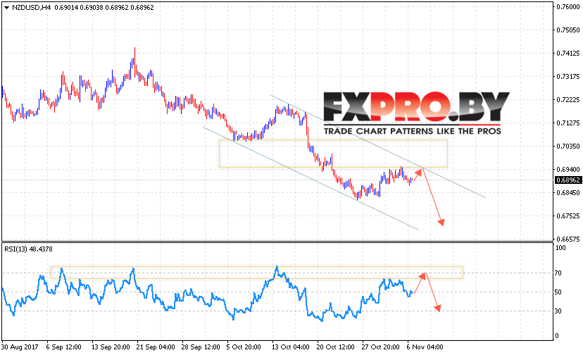 Таким образом, Форекс прогноз и аналитика NZD/USD на 7 ноября 2017 предполагает попытку роста в область верхней границы канала на уровне 0.6960, откуда стоит ожидать продолжения падения с целью ниже уровня 0.6680, отменой варианта падения NZD/USD станет сильный рост и пробой области 0.7035.