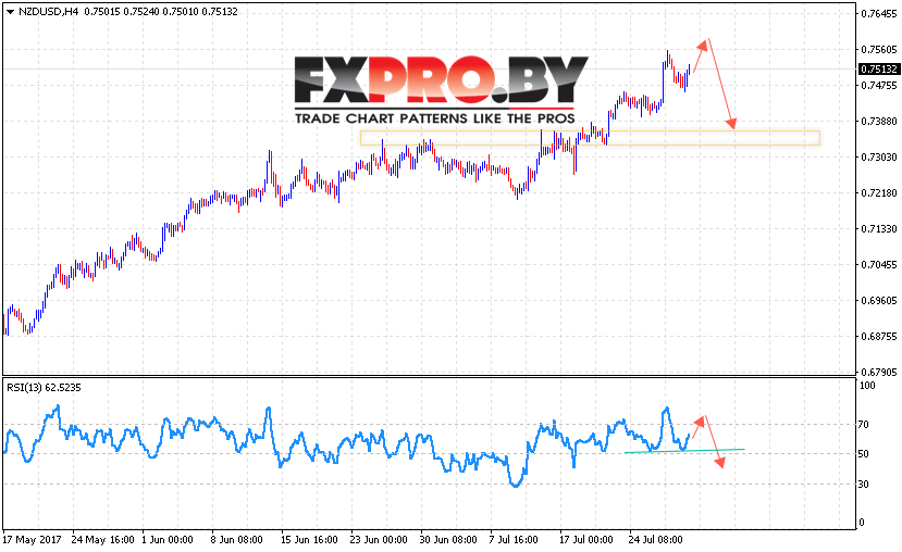 Таким образом, NZD/USD прогноз Новозеландского Доллара на 1 августа 2017 предполагает попытку снижения в область 0.74 в рамках отработки разворотной модели на индикаторе относительной силы.