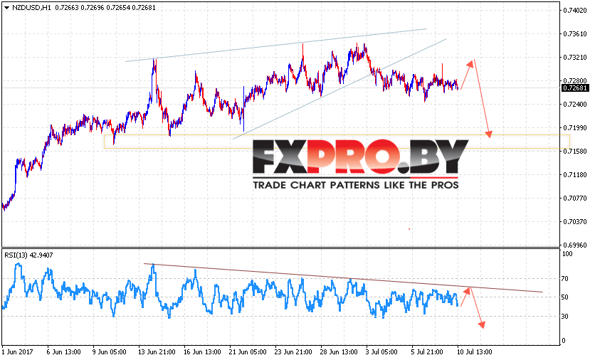 Таким образом, NZD USD прогноз Новозеландского Доллара на 11 июля 2017 предполагает попытку продолжения снижения в область ниже уровня 0.7150 в рамках отработки Форекс модели Клин, отменой станет пробой области 0.7370, что укажет на продолжение роста пары.