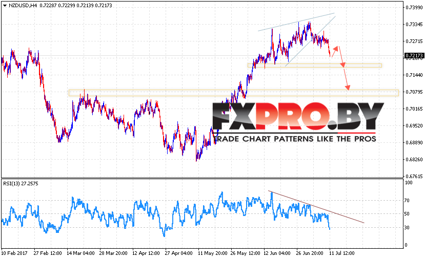 Таким образом, NZD/USD прогноз Новозеландского Доллара на 12 июля 2017 предполагает попытку продолжения снижения в область ниже уровня 0.7080 в рамках отработки Форекс модели Клин, отменой станет пробой уровня локального максимума.