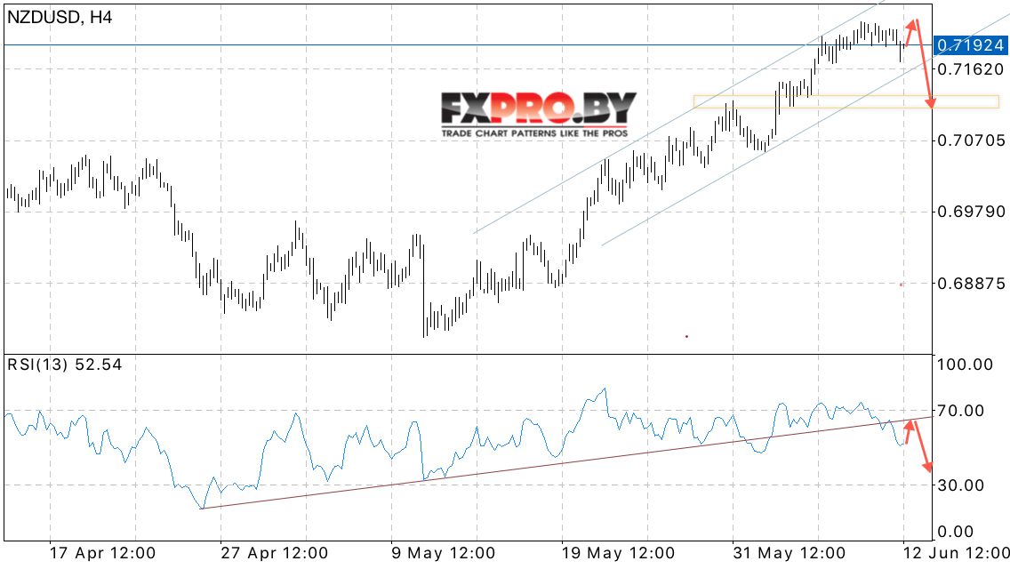Таким образом, NZD/USD прогноз Новозеландского Доллара на 13 июня 2017 предполагает попытку теста области локального максимума и начала снижения в область ниже уровня 0.7120, дополнительным сигналом выступит тест пробитой линии тренда на индикаторе относительной силы.