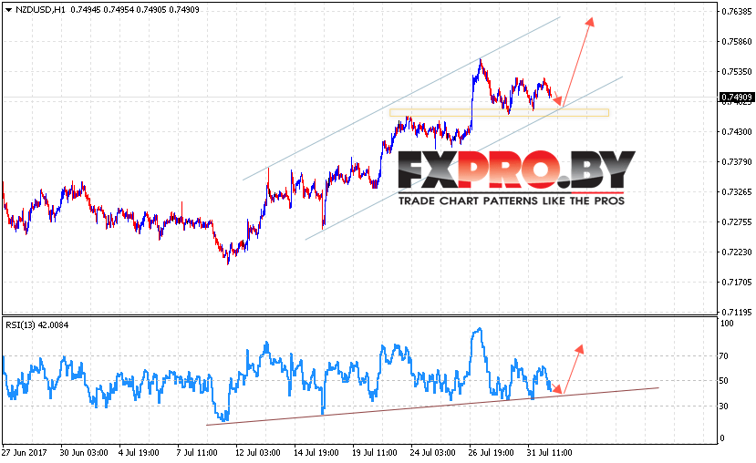 Таким образом, NZD/USD прогноз Новозеландского Доллара на 2 августа 2017 предполагает попытку отскока от нижней границы канала и продолжение роста пары в область 0.7640, дополненным сигналом выступает тест линии поддержки на индикаторе относительной силы.