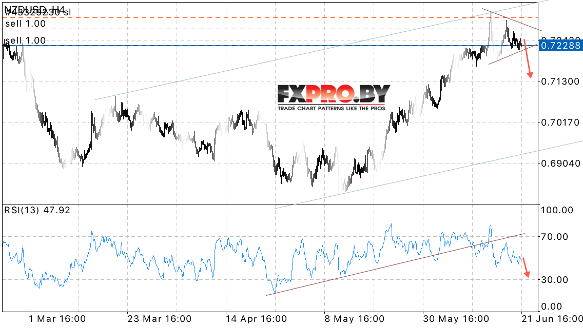 В пользу падения котировок NZD/USD выступает пробой восходящей линии тренда на индикаторе относительной силы. Отменой варианта падения станет пробой области локального максимума.