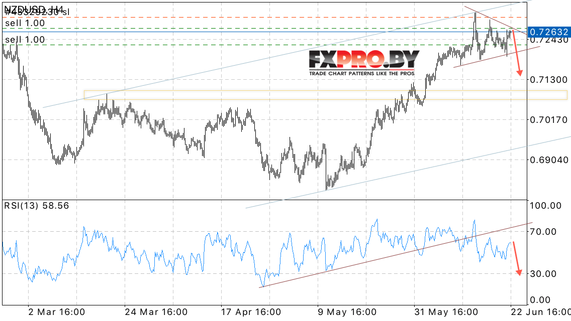 В пользу падения пары NZD/USD выступает пробой линии тренда на индикаторе относительной силы. Отменой варианта падения станет пробой области локального максимума, что укает на продолжение роста.