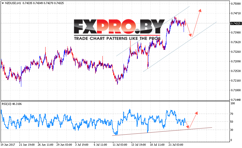 Таким образом, NZD/USD прогноз Новозеландского Доллара на 26 июля 2017 предполагает попытку отскока от нижней границы восходящего канала и продолжения роста выше уровня 0.75, отменой станет пробой уровня нижней границы канала.