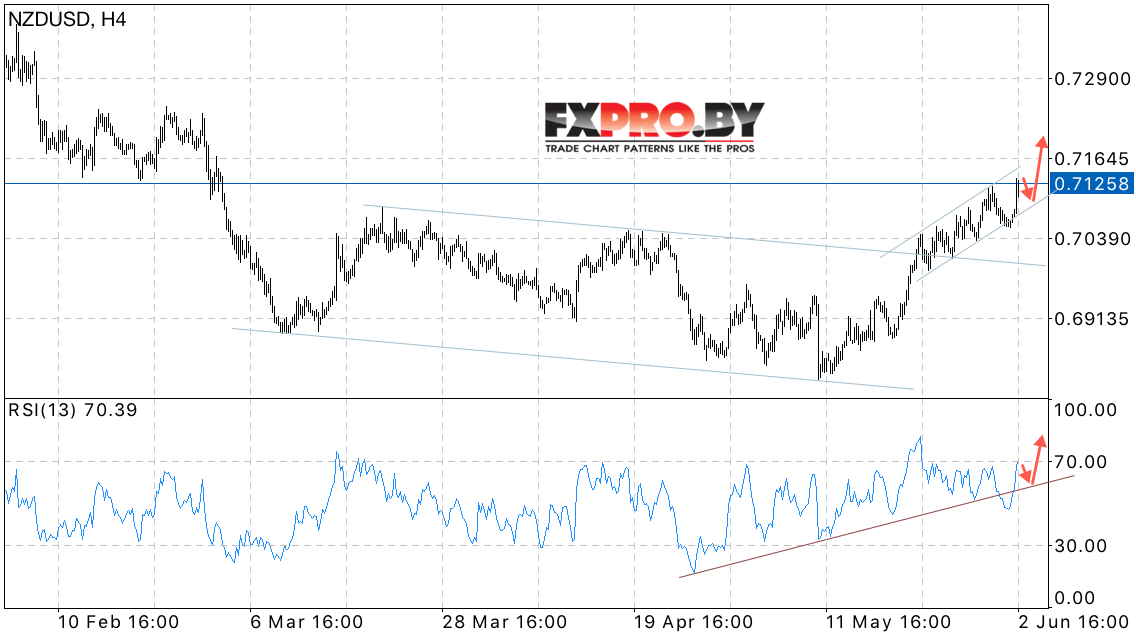 Таким образом, NZD/USD прогноз Новозеландского Доллара на 5 июня 2017 предполагает попытку продолжения роста в область выше уровня 0.7180, дополнительным сигналом выступит тест линии поддержки на индикаторе относительной силы.