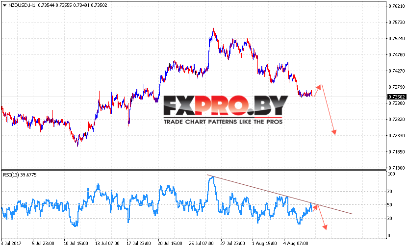 В пользу падения котировок пары выступит тест линии сопротивления на индикаторе относительной силы. Отменой варианта падения станет сильный рост и пробой области 0.7420, что укажет на продолжение роста NZD/USD.
