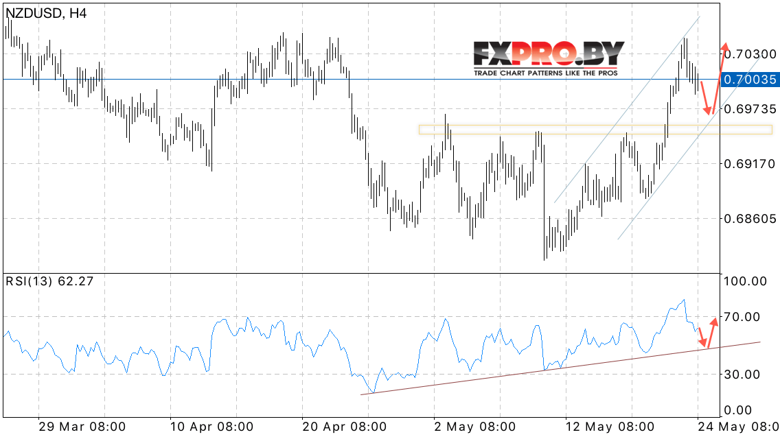 Таким образом, Технический анализ и прогноз NZD/USD на 25 мая 2017 предполагает попытку коррекции в область нижней границы восходящего канала, откуда стоит ожидать отскок и продолжения роста пары, отменой станет пробой области 0.6950, в этом случае стоит ожидать продолжения снижения.