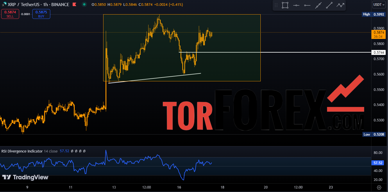 Уровень сопротивления XRP находится на значении $0.60. Прорыв выше данного уровня может подтолкнуть цену к следующему уровню сопротивлению — $0.6527.