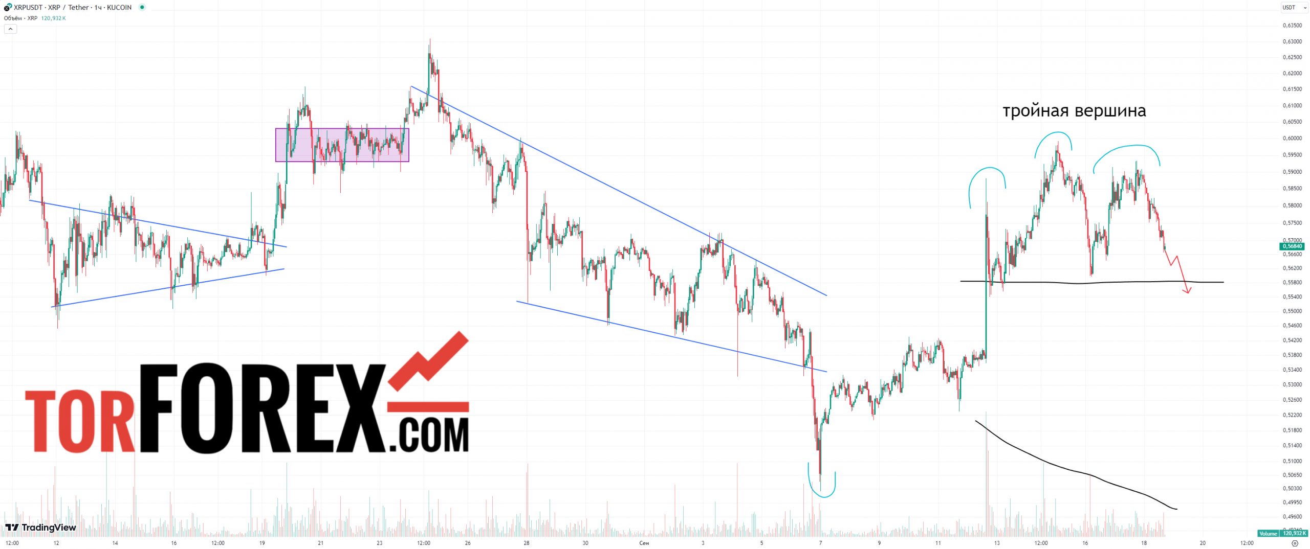 Наш прогноз стоимости Рипл получает большее подтверждение благодаря снижающимся объемам торгов. Трейдеры теряют интерес к активу с каждой новой вершиной 13го, 15го и 18го сентября. Именно этот фактор на низких объемах продолжит толкать цену к нашим целям.