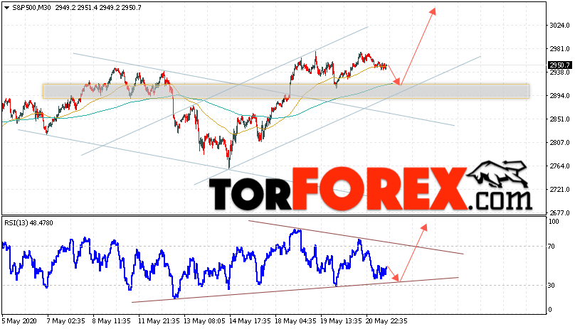 Таким образом, S&P 500 прогноз и аналитика на 22 мая 2020 предполагает попытку теста уровня поддержки вблизи области 2905. Затем, продолжение роста в область выше уровня 3055. В пользу подъёма котировок S&P 500 выступит тест линии поддержки на индикаторе относительной силы. Отменой варианта роста станет падение стоимости индекса и пробой области 2845. Это укажет на продолжение падения с целью ниже области 2755.
